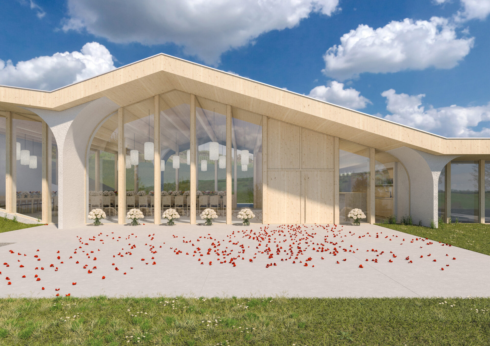 Architektonický koncept propojuje dynamiku a pevnost. Dominantním prvkem hlavní fasády je jemně zalomená křivka střechy, která je nesena třemi rozevírajícími se sloupy evokujícími otevřenost a propojení interiéru s okolním prostředím. Prosklená fasáda orientovaná k vinohradu umožňuje plynulé propojení s krajinou a zajišťuje vizuální kontakt s exteriérem.
