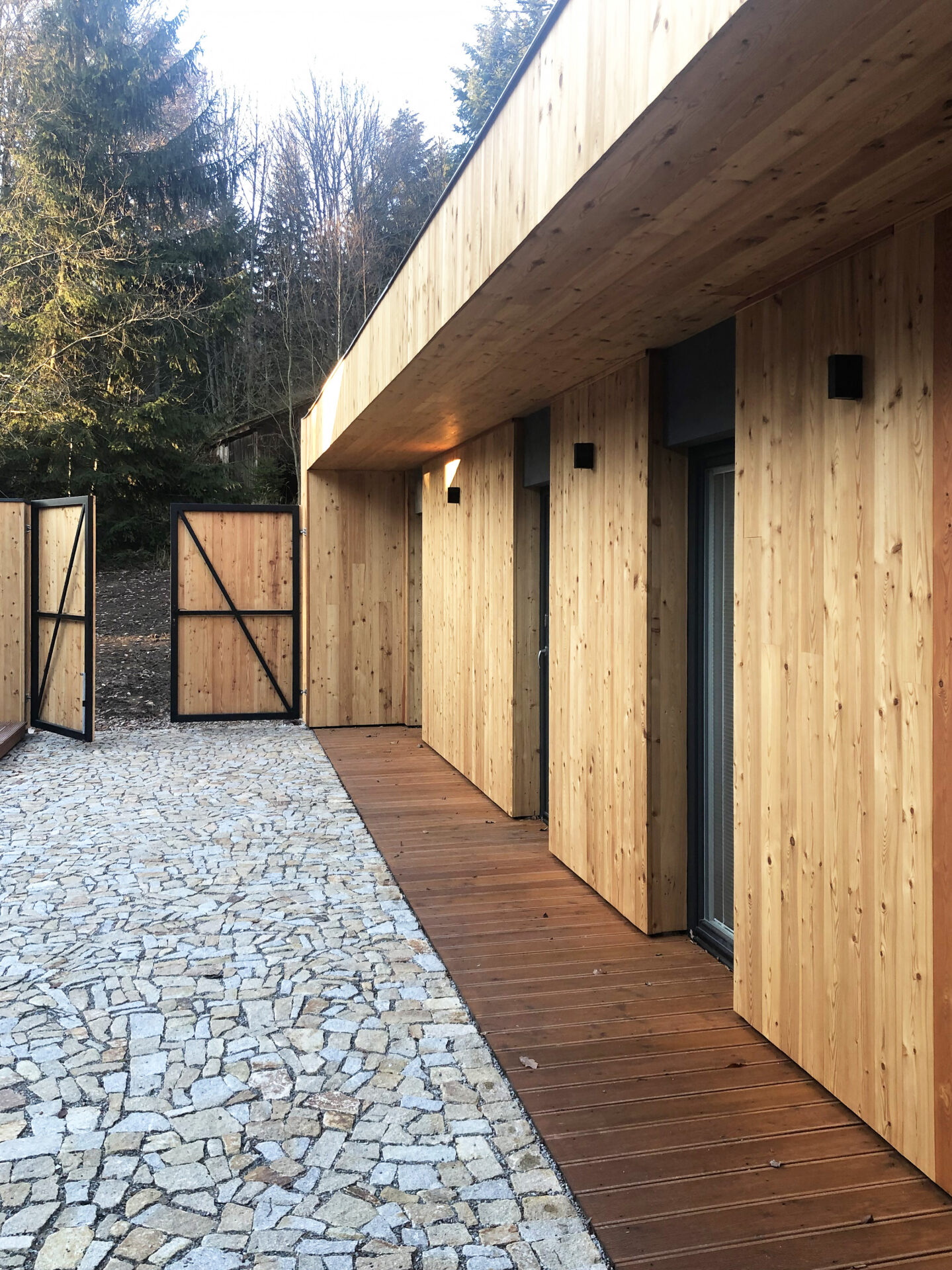 Přestavba zahrnuje rekonstrukci původní hájovny a novostavbu obytných křídel, na půdorysu dřívějšího hospodářského dvora. Nová jednopodlažní část je zastřešená kombinací ploché a pultové střechy a soudobým tvaroslovím se vymezuje oproti původnímu objektu. Fasáda dostavby je obložena jednoduchým svislým dřevěným obkladem, který nechává vyniknout historické hájovně s očištěnou cihelnou fasádou. Celek, tak díky použitým materiálům, působí vyváženě a harmonicky v dialogu mezi tradičním a soudobým.