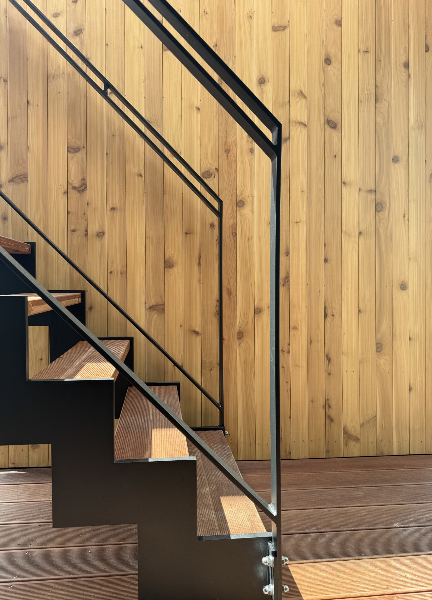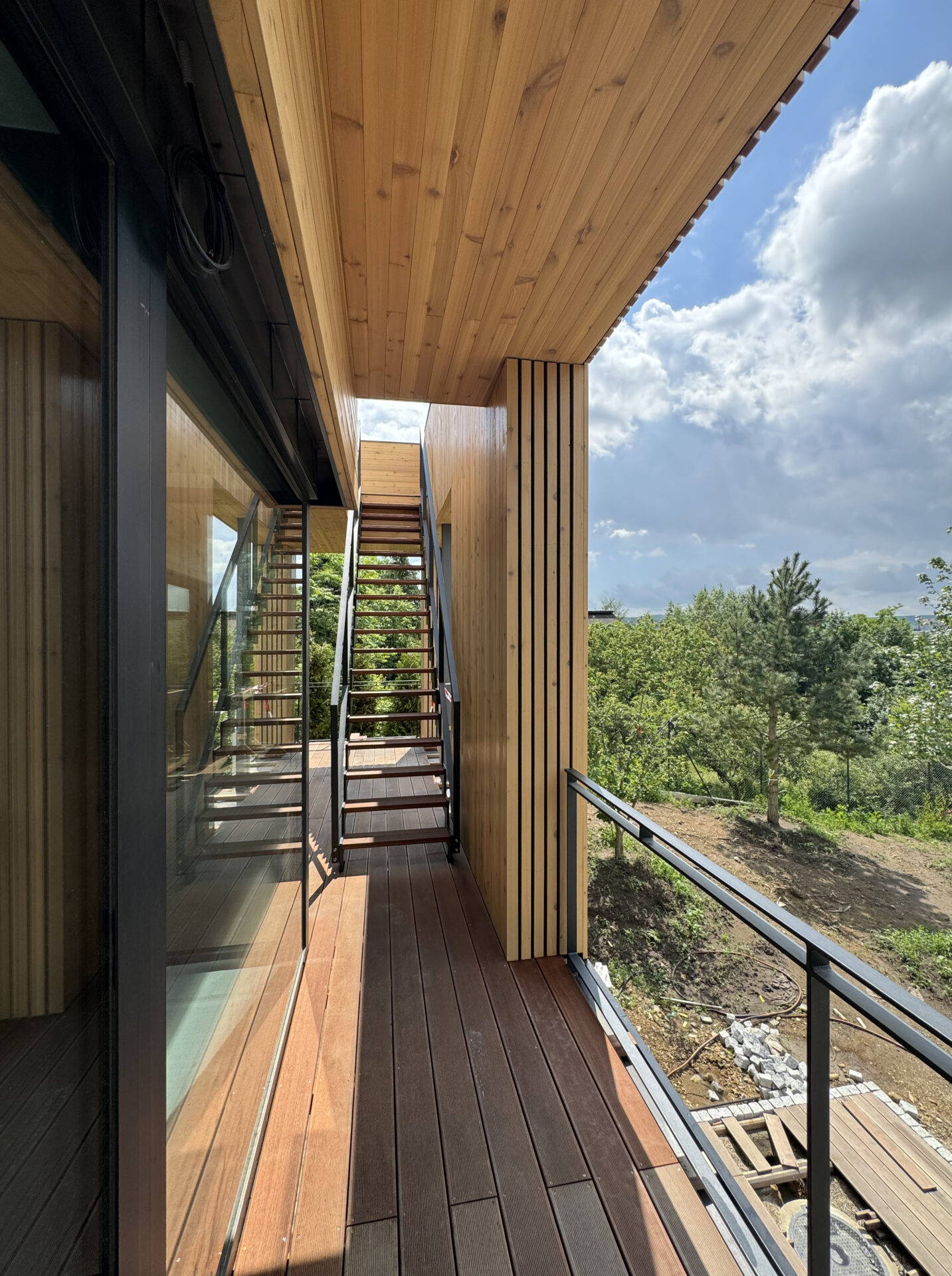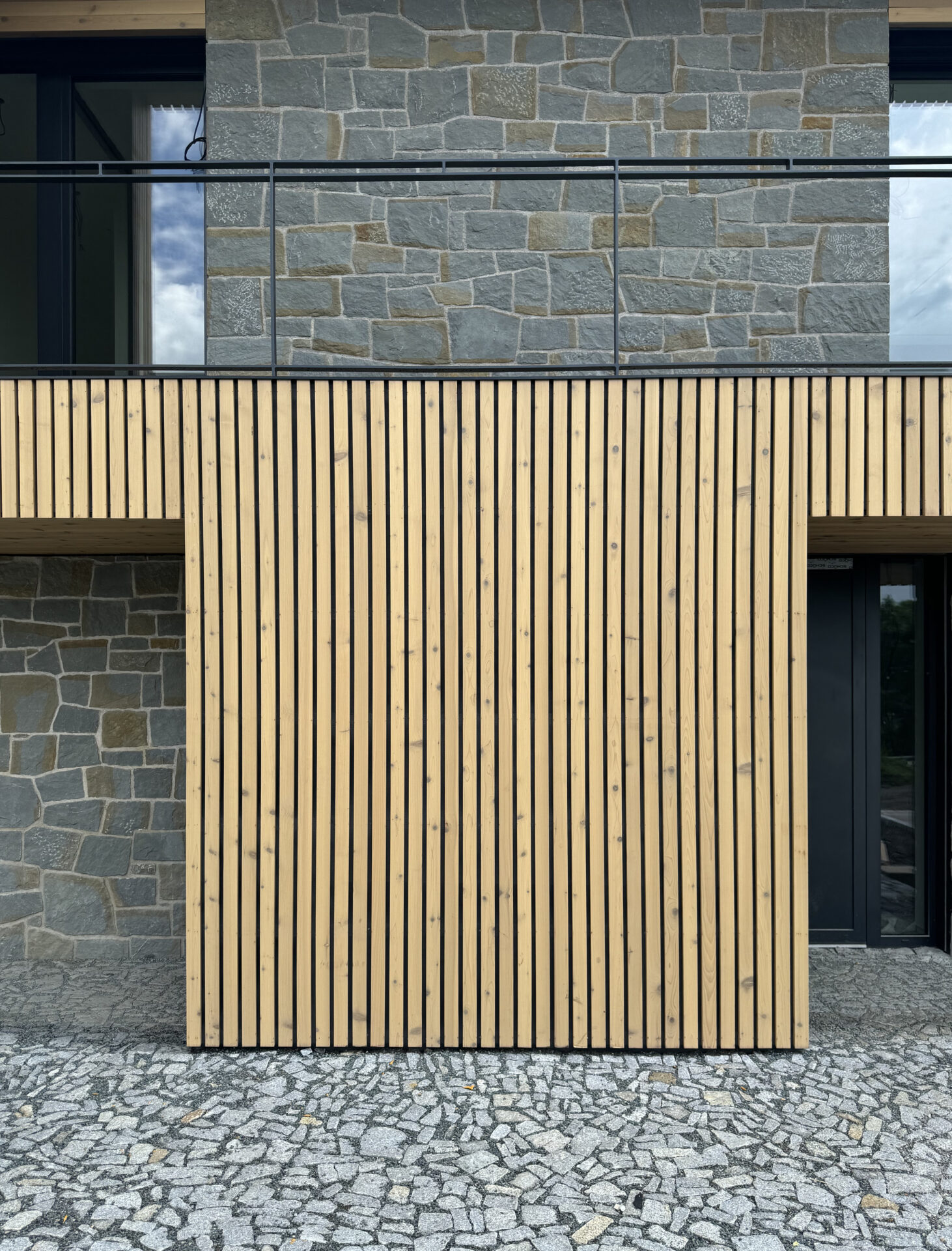 Fasády jsou prolomeny velkými prosklenými plochami, doplněnými v západní části o terasu s výhledem na přehradu. Materiálové a barevné řešení využívá tradiční přírodní materiály, kamenný a dřevěný obklad v jejich přirozených přírodních barvách.
