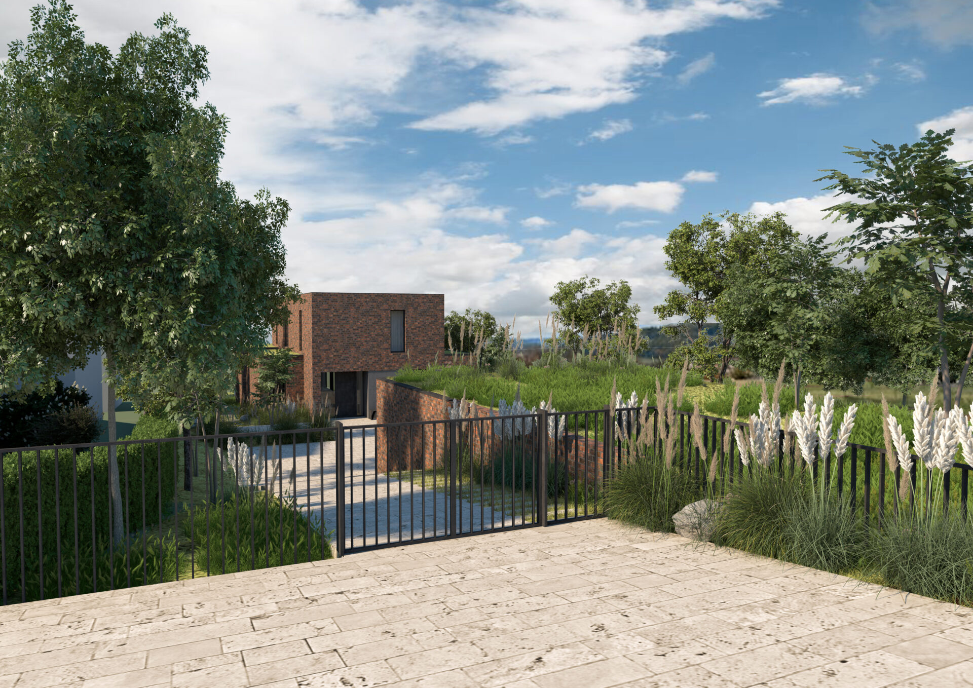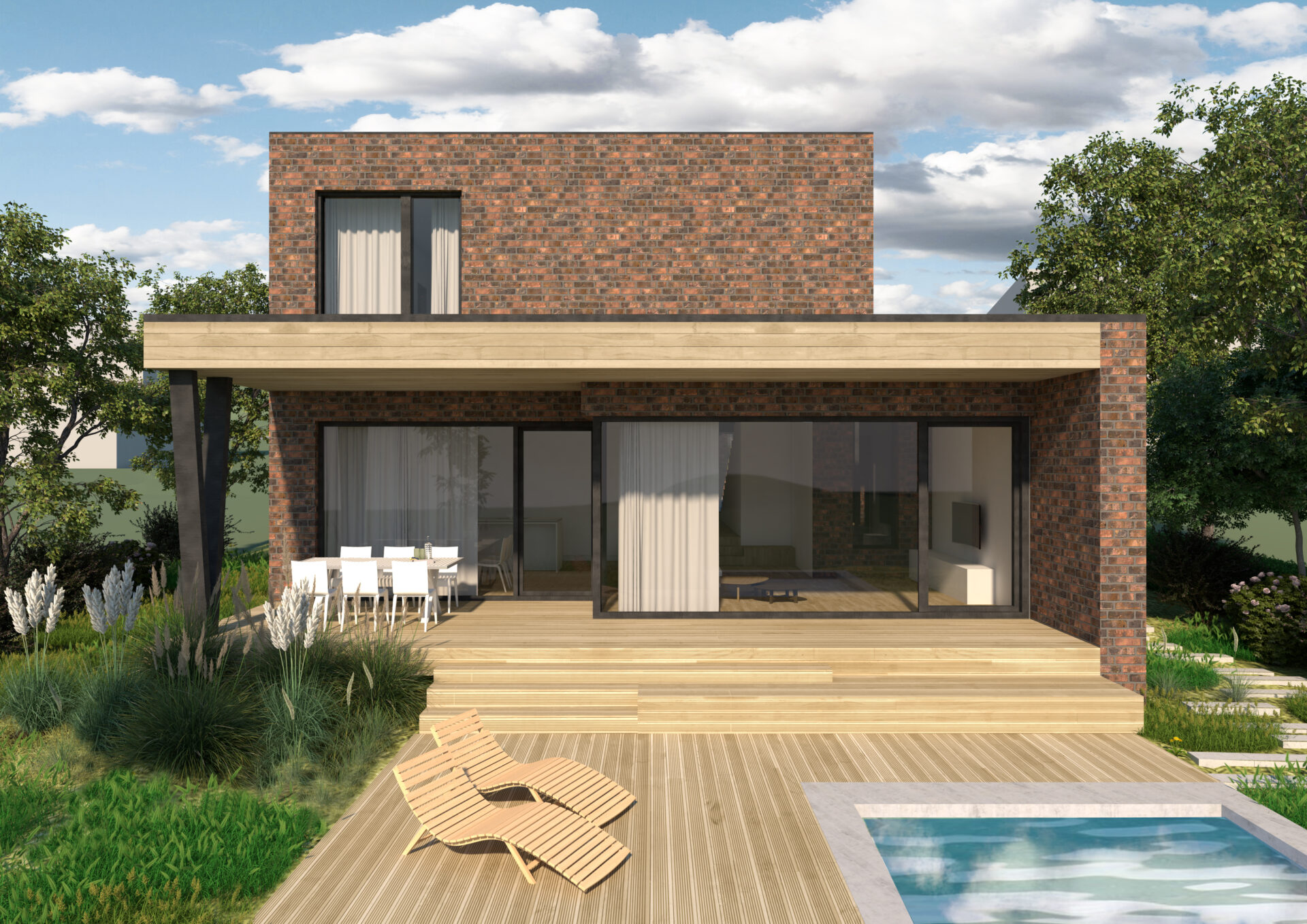 Tento rodinný dům má moderní, minimalistickou architekturu s důrazem na jednoduché geometrické tvary a kvalitní materiály. Fasáda kombinuje režné cihlové zdivo s dřevěnými prvky, které vytvářejí vizuálně atraktivní kontrast. Velké prosklené plochy propojují interiér s exteriérem a zajišťují dostatek přirozeného světla.