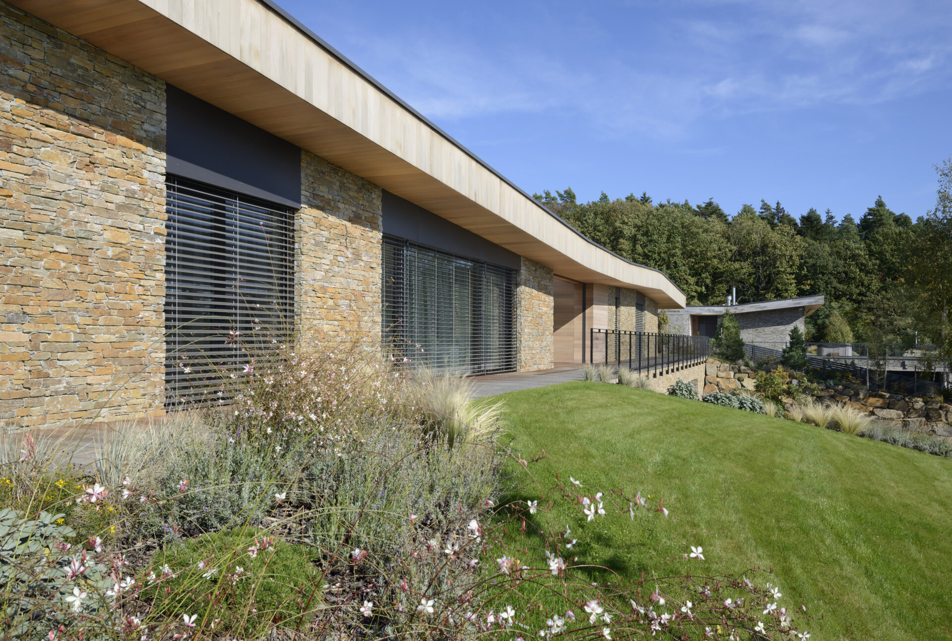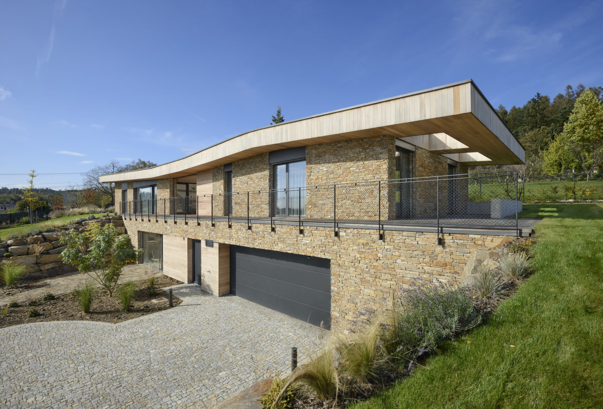 Rodinný dům situovaný v příčně se svažujícím pozemku na kraji obce je součástí společného záměru, jehož druhou částí je další rodinný dům situovaný na samostatné parcele blíže k lesu.